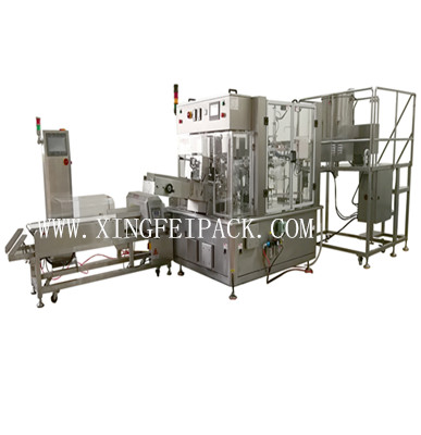 包裝流程(工位分布):1)上袋—2)色帶(噴碼)打碼(選項)—3)開自立袋底—4)開袋口—5)一次充填—6)二次充填(選項或者備用)—7)熱封口(同時排氣)—8)冷封口和產品輸出。